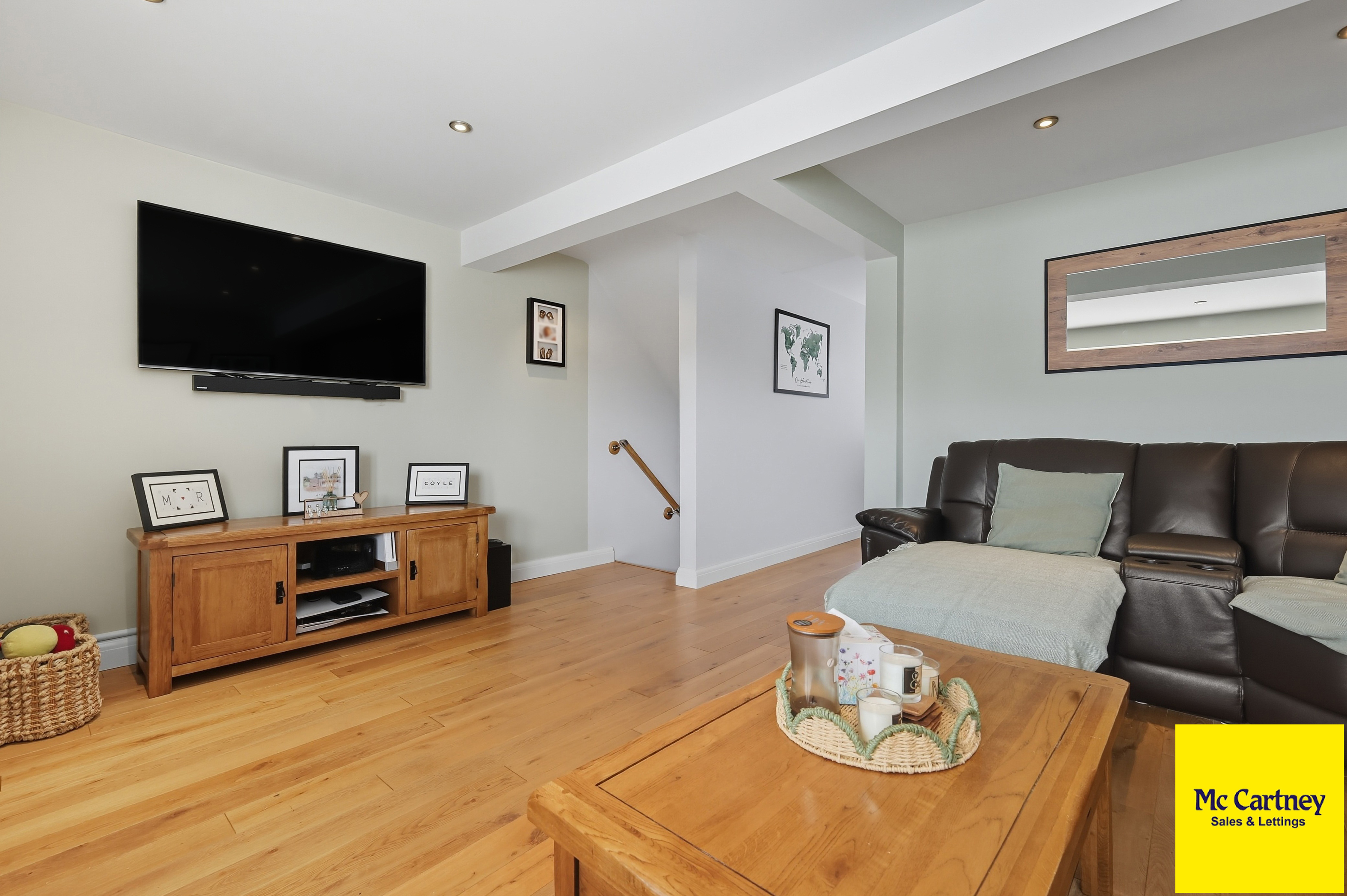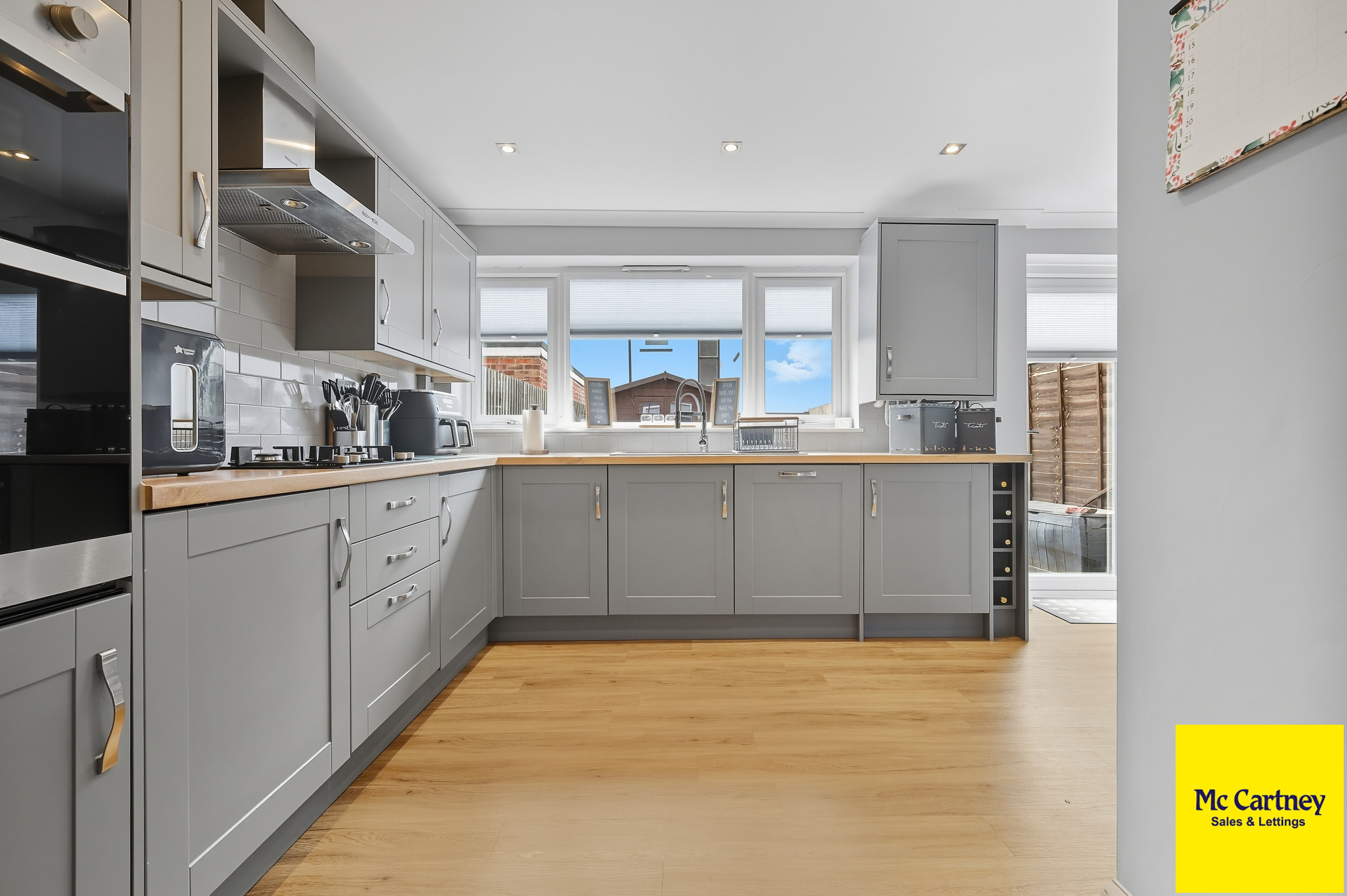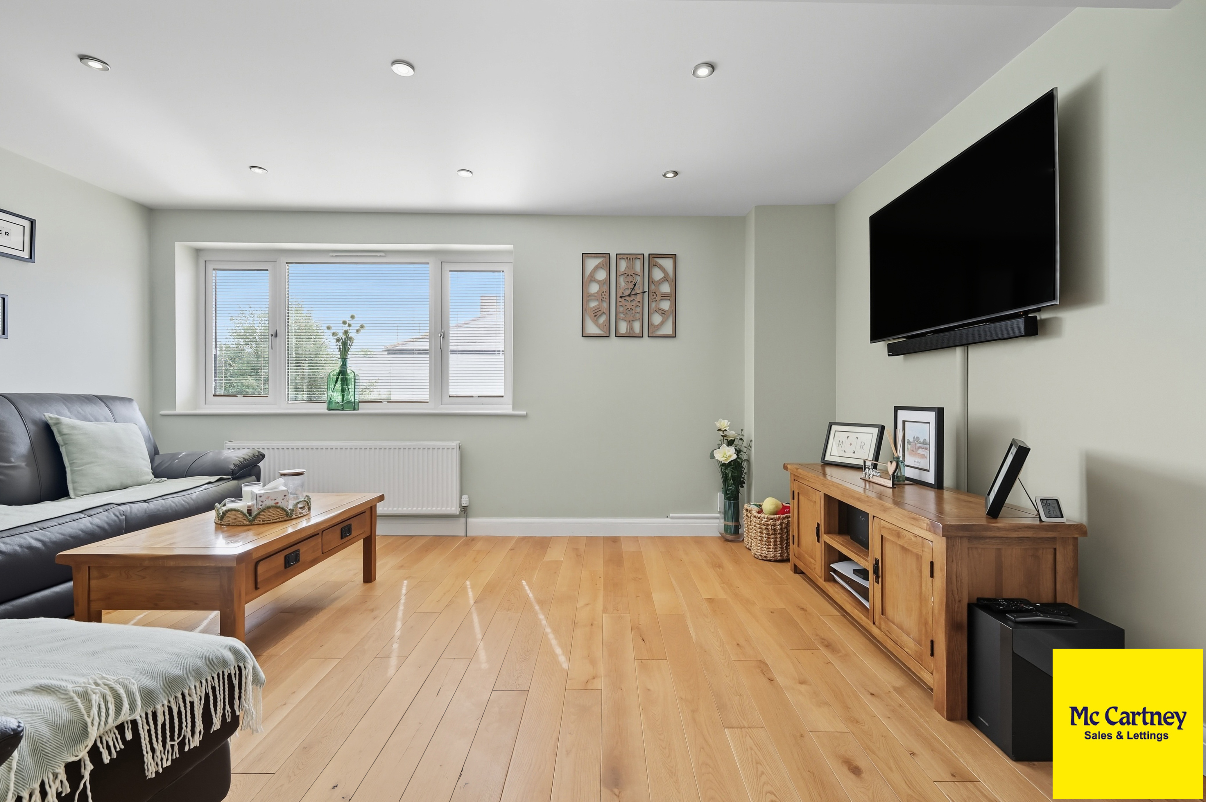 The heart of this home is the open-plan kitchen/dining room, which has been thoughtfully designed with a range of sleek shaker-style units, integrated double ovens, gas hob, extractor, and space for further appliances. The light décor, wood-effect worktops, and metro-tiled splashbacks give the kitchen a timeless look, while the generous dining area comfortably accommodates a six-seater table – perfect for family meals and entertaining.
