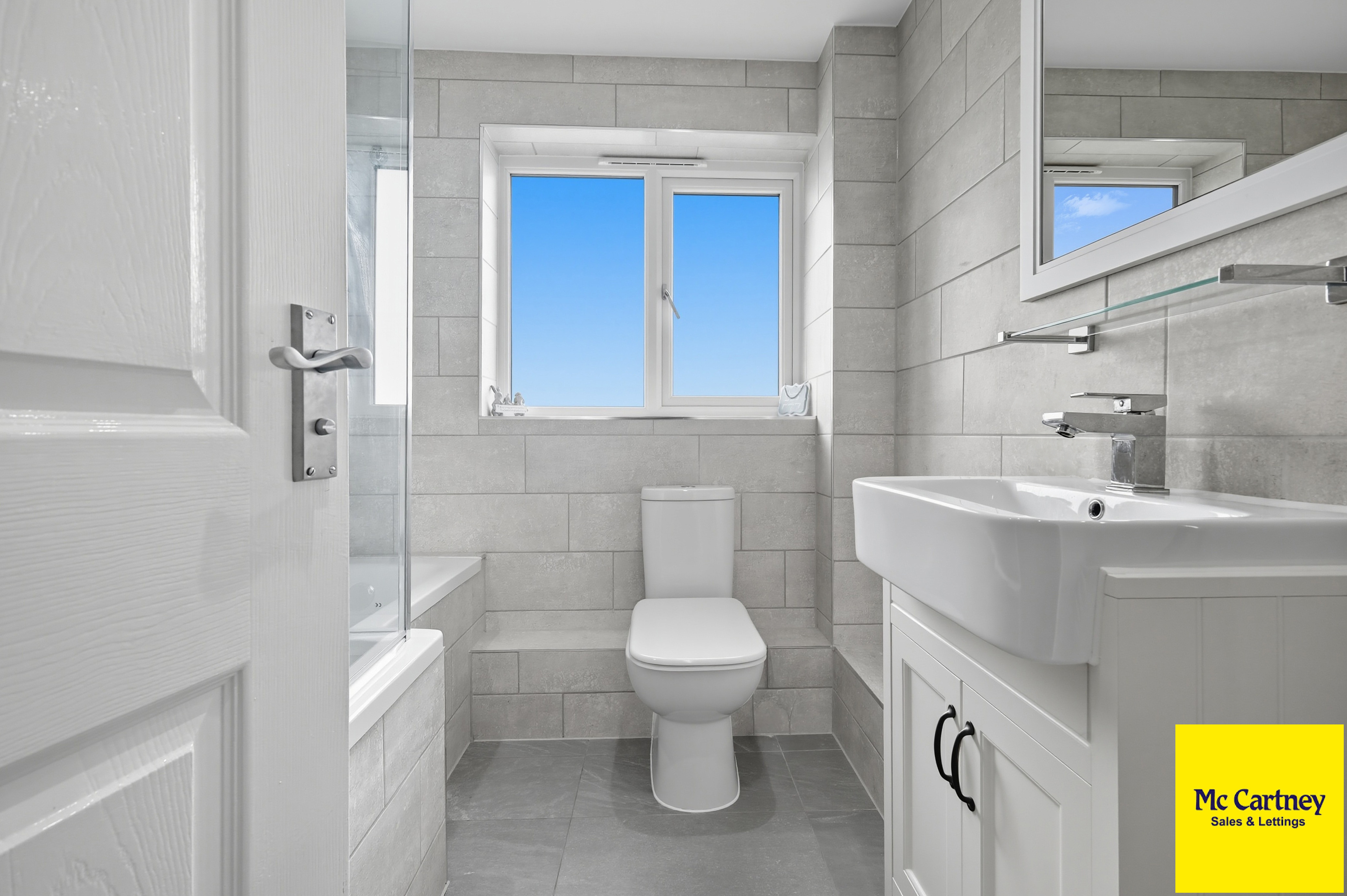 The family bathroom is luxuriously finished with a three-piece white suite, including a shower-over-bath with glass screen, a vanity wash hand basin with storage, and modern chrome fittings, all complemented by contemporary grey tiling.