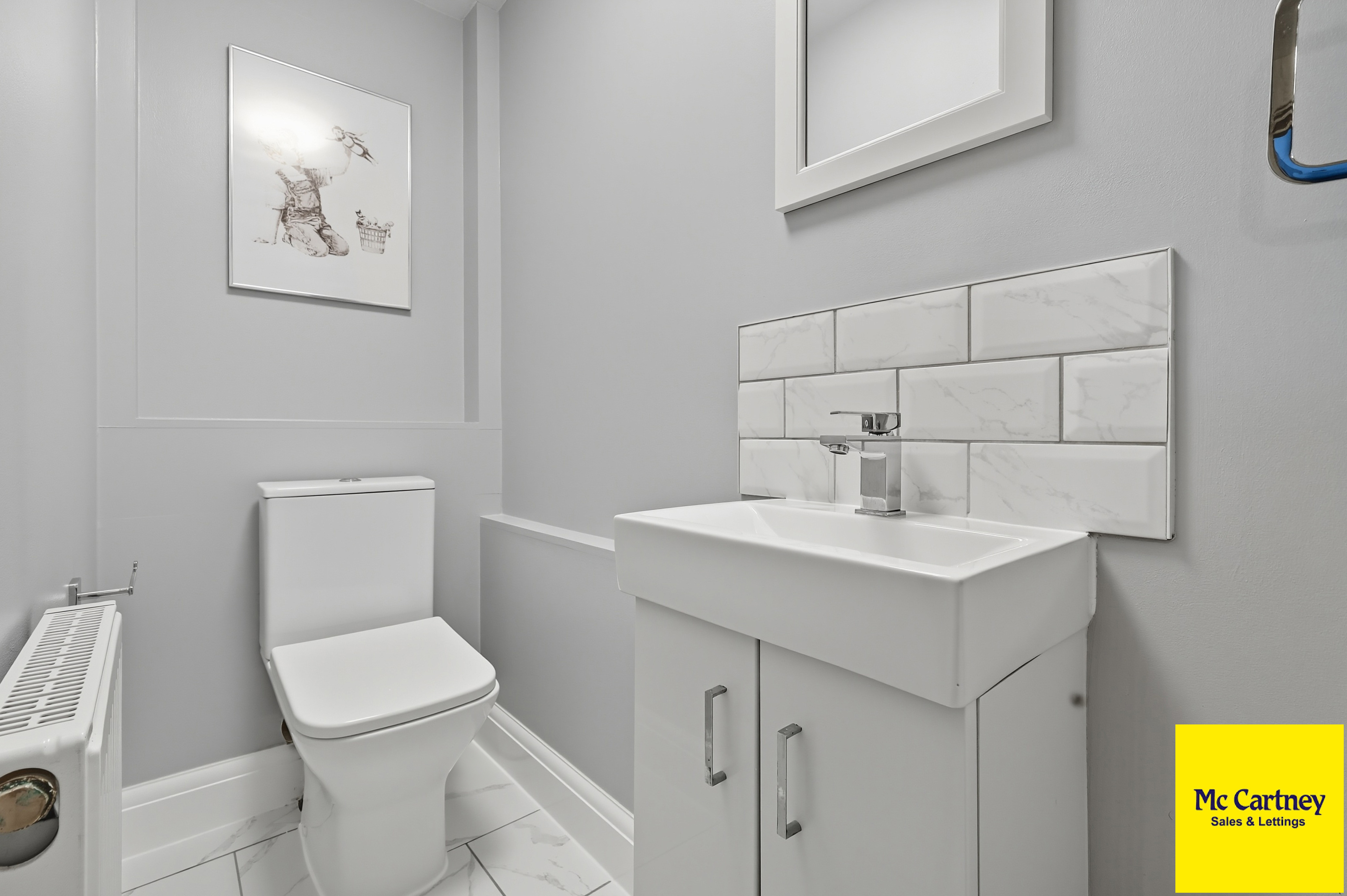 A convenient cloakroom/WC is positioned just off the hallway, fitted with a modern vanity unit and contemporary tiling.