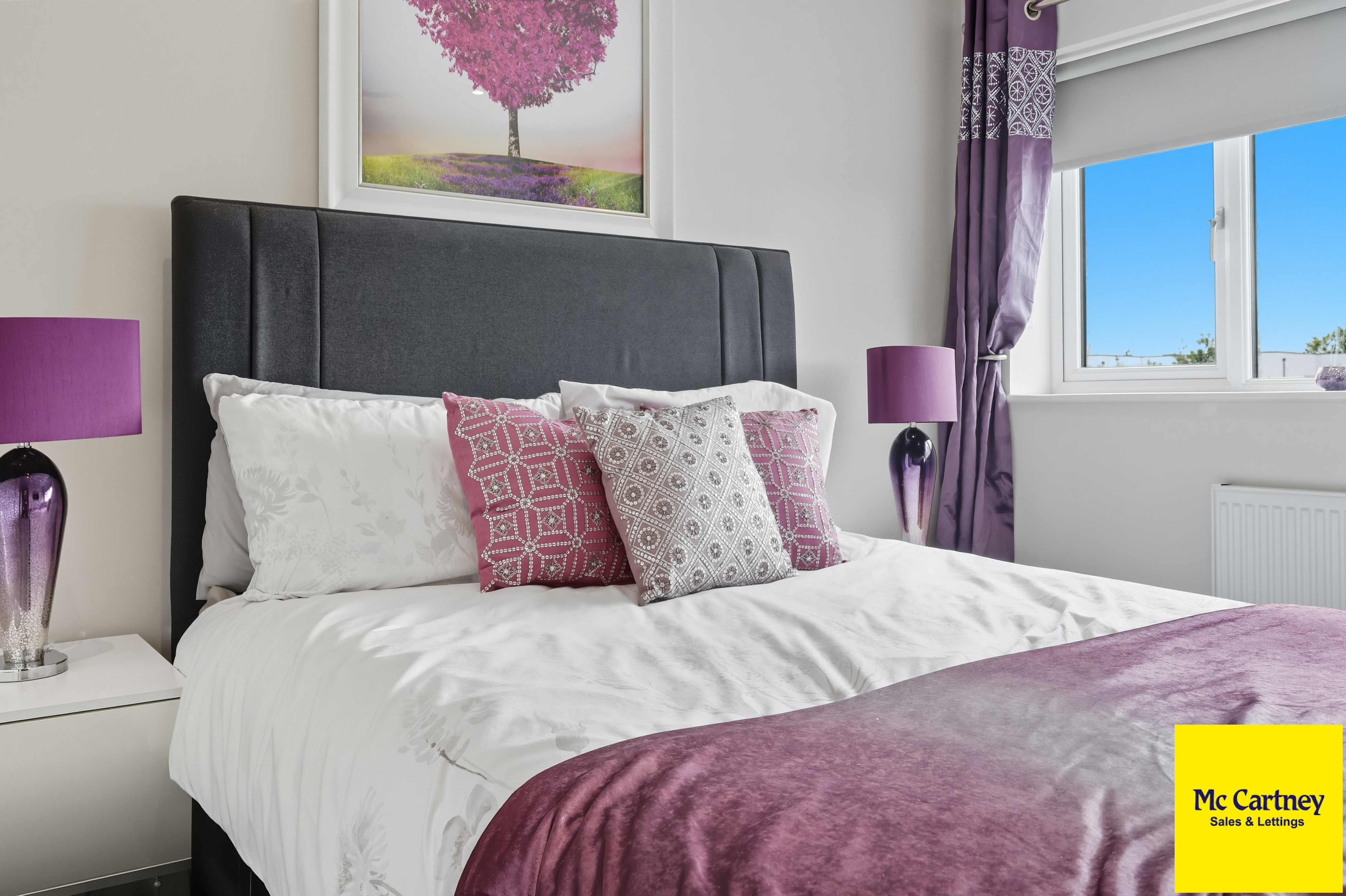 Also on this floor is Bedroom Three, which works equally well as a guest room, nursery, or dedicated home office. Two useful built-in storage cupboards are positioned off the landing, providing practical space for household essentials.
