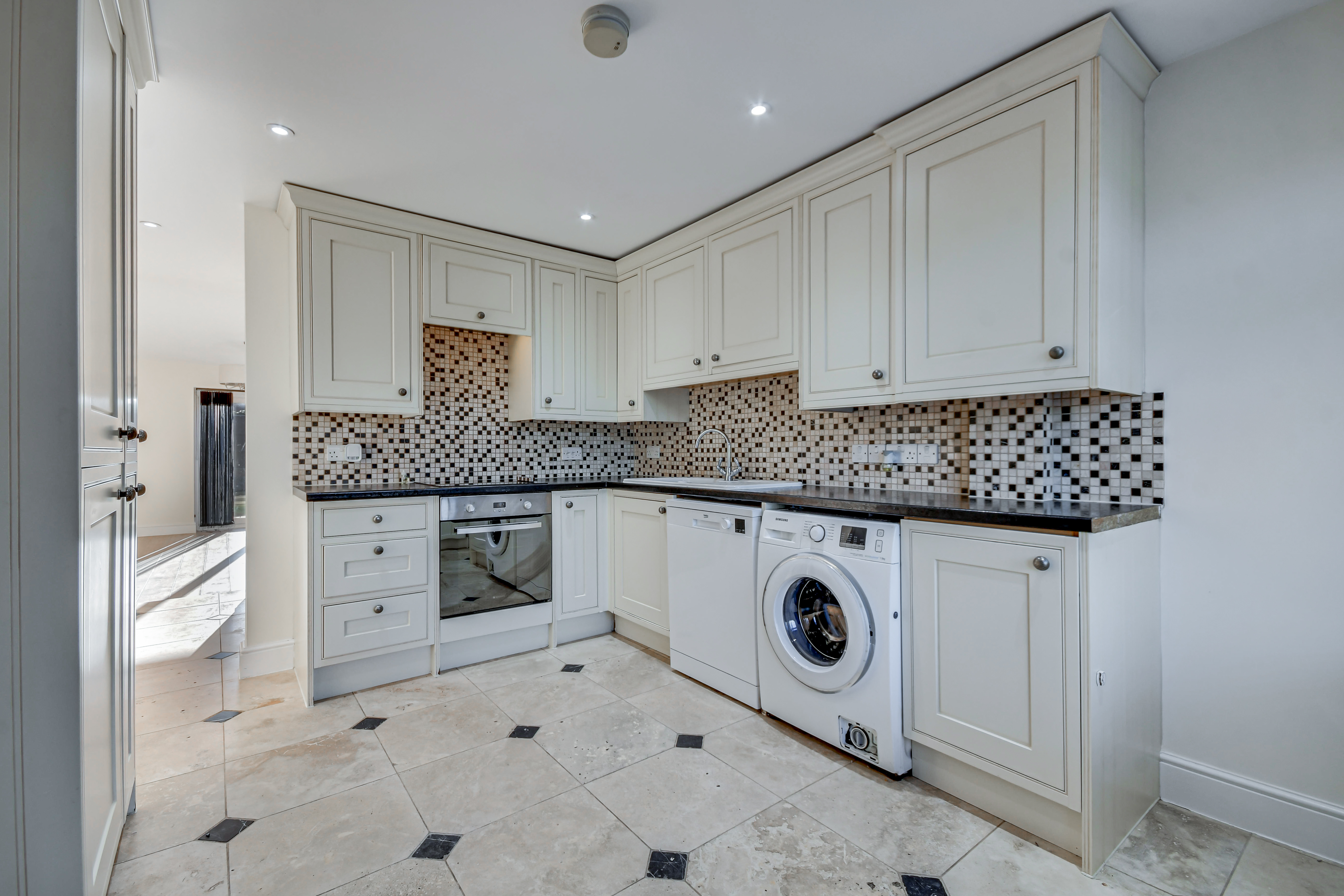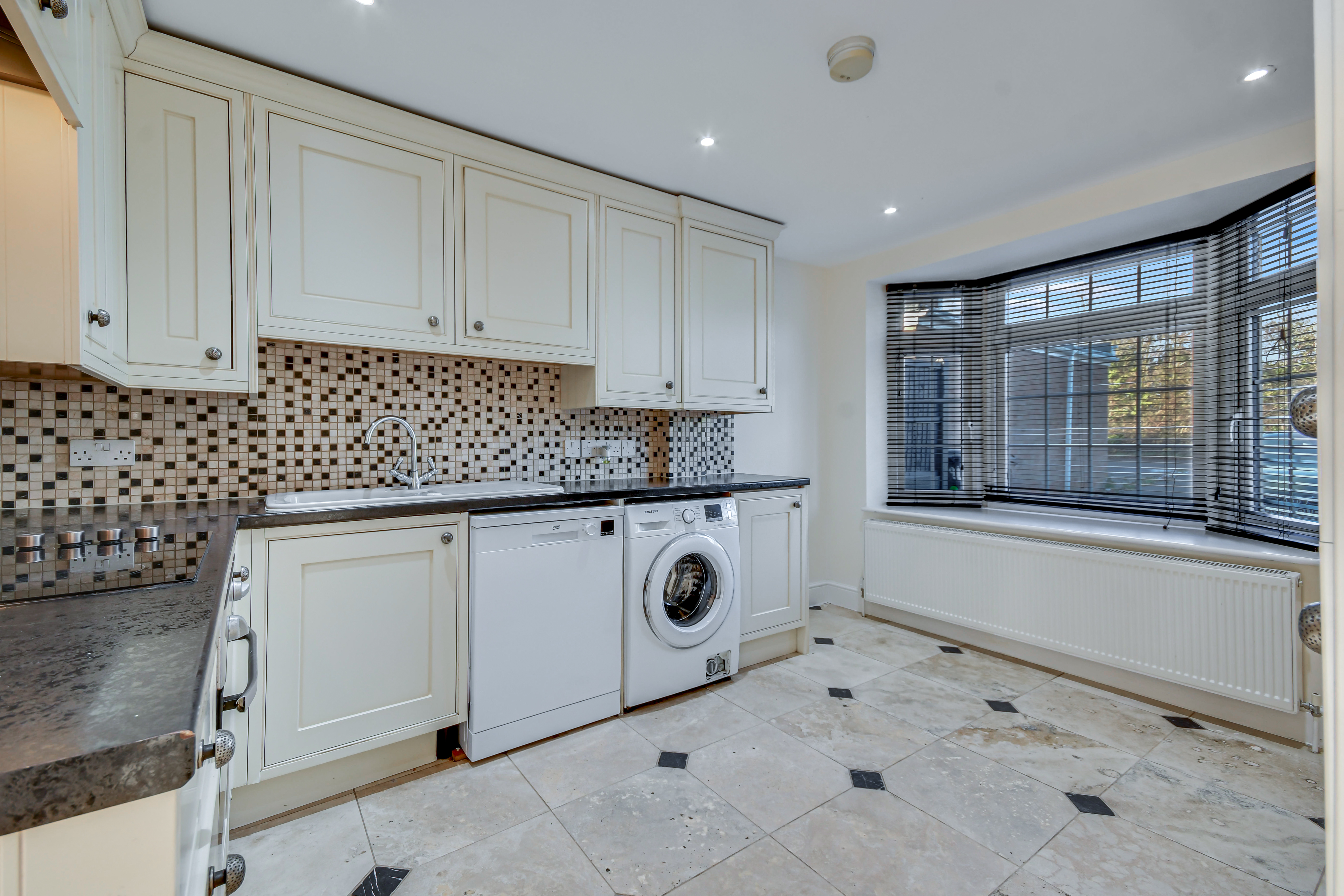 A well-appointed kitchen fitted with a range of matching wall and base units, integrated oven and hob, ample worktop space and room for appliances. The kitchen benefits from excellent natural light and tiled flooring, with direct access to the adjoining utility/home office.