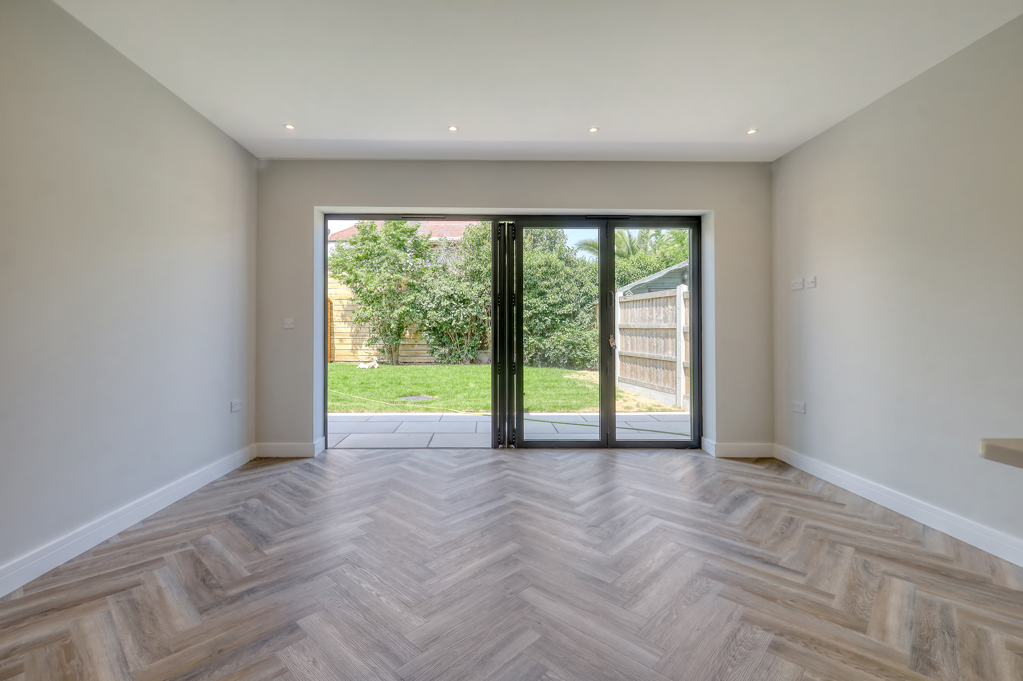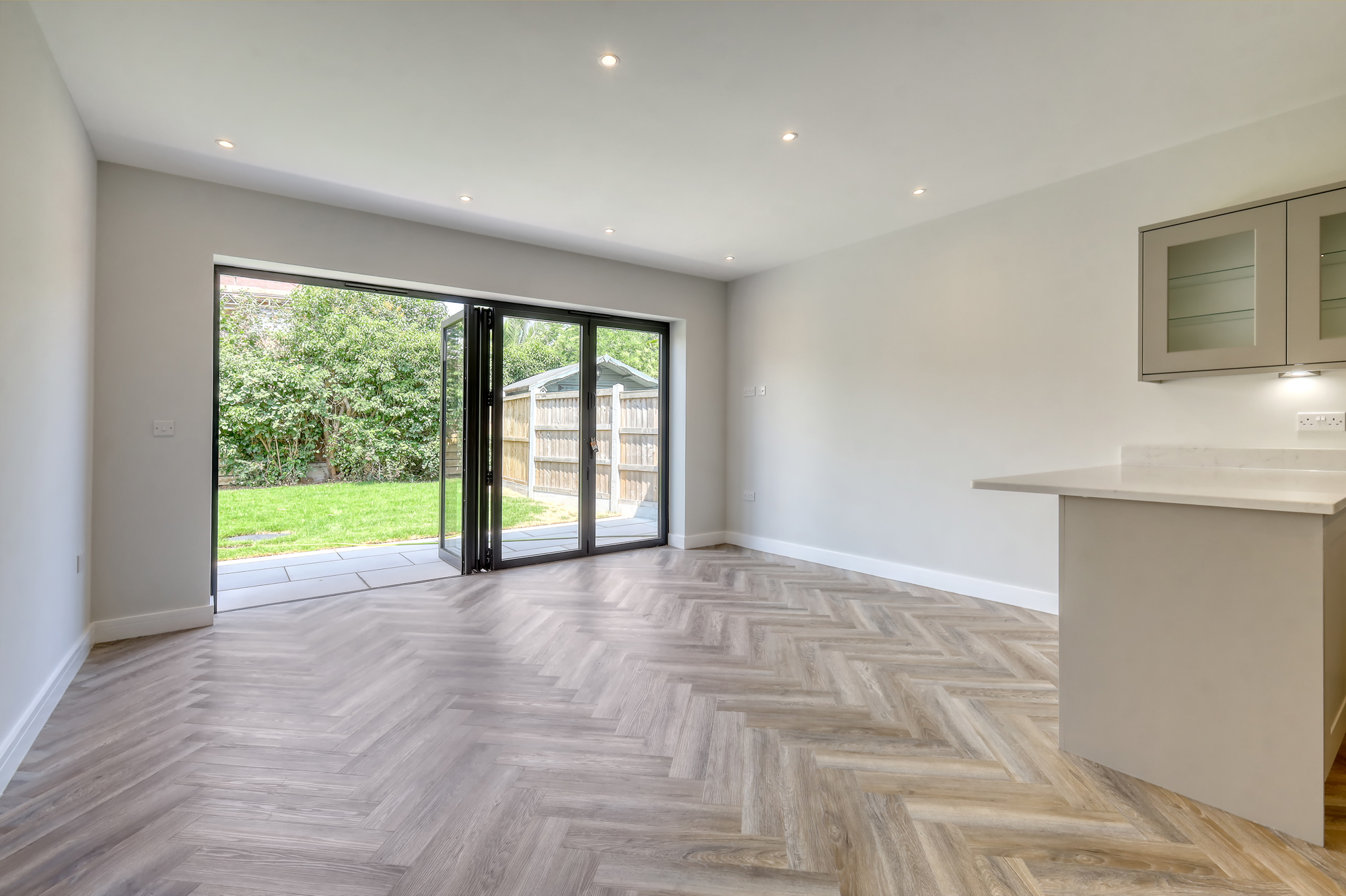 • Open-Plan Kitchen / Living / Dining Room – A bright and spacious living area featuring a sleek, designer kitchen with stone worktops and integrated appliances. Bi-fold doors open directly onto the rear garden, creating a seamless connection between indoor and outdoor living.